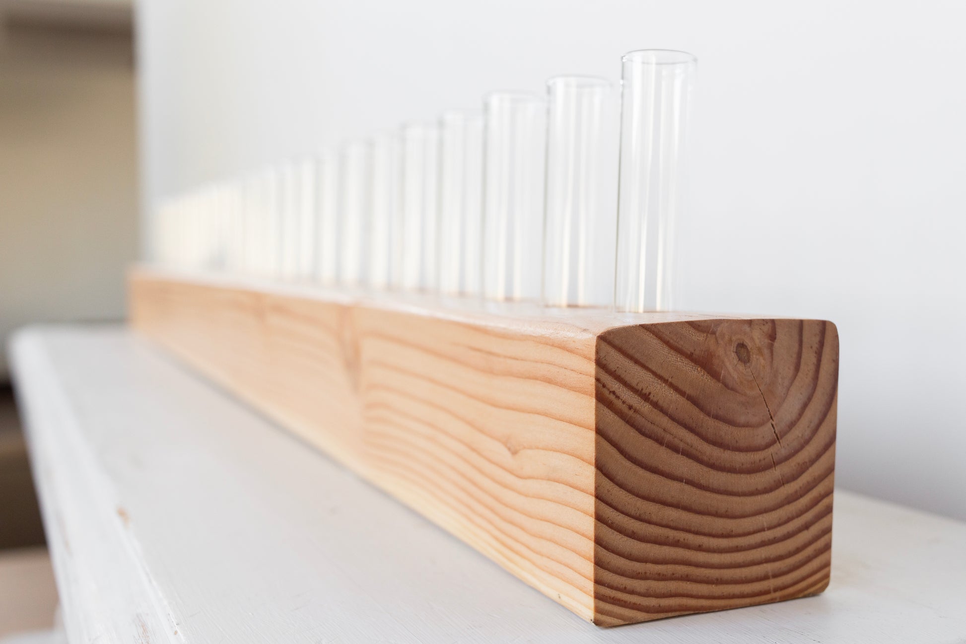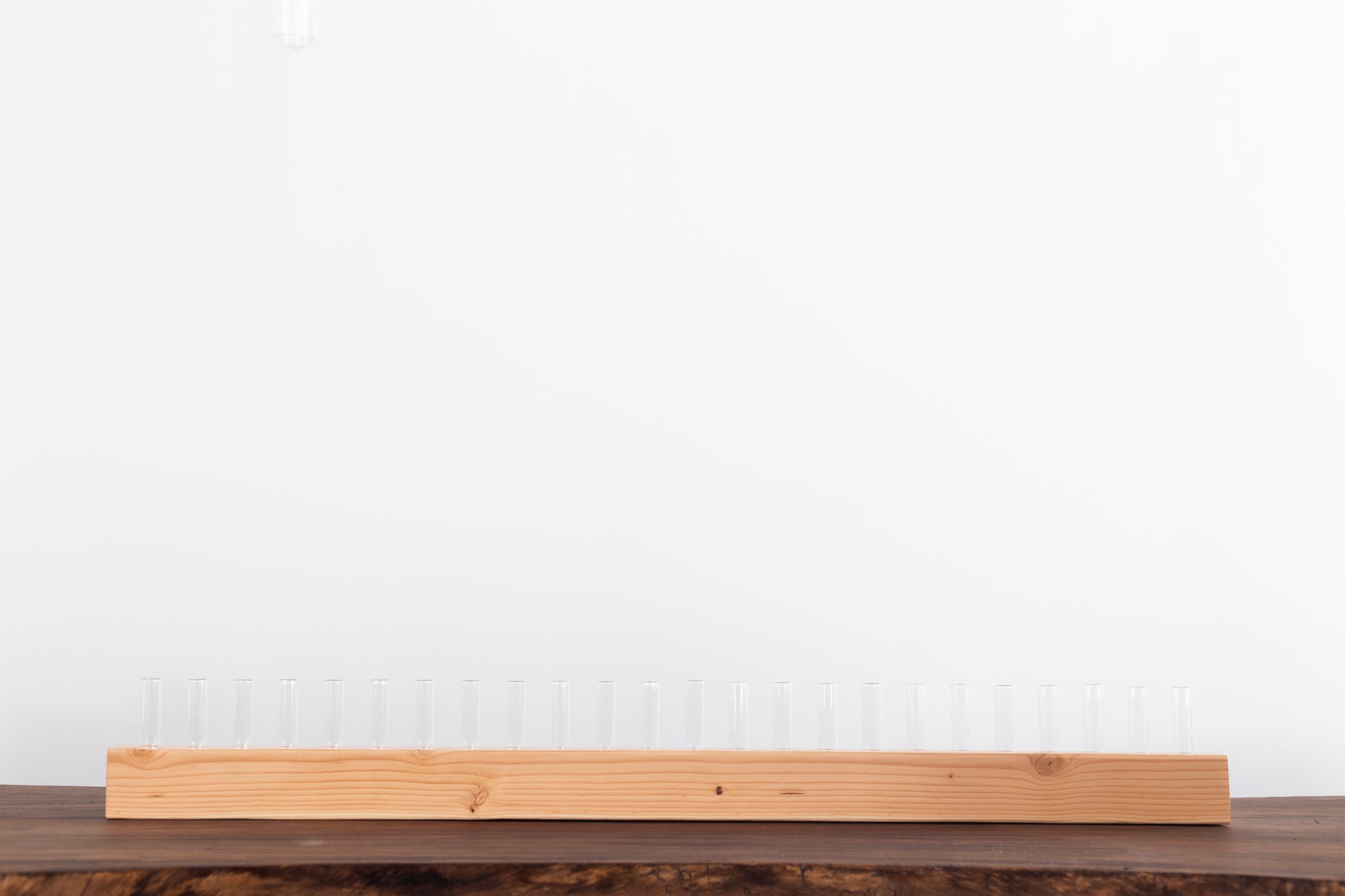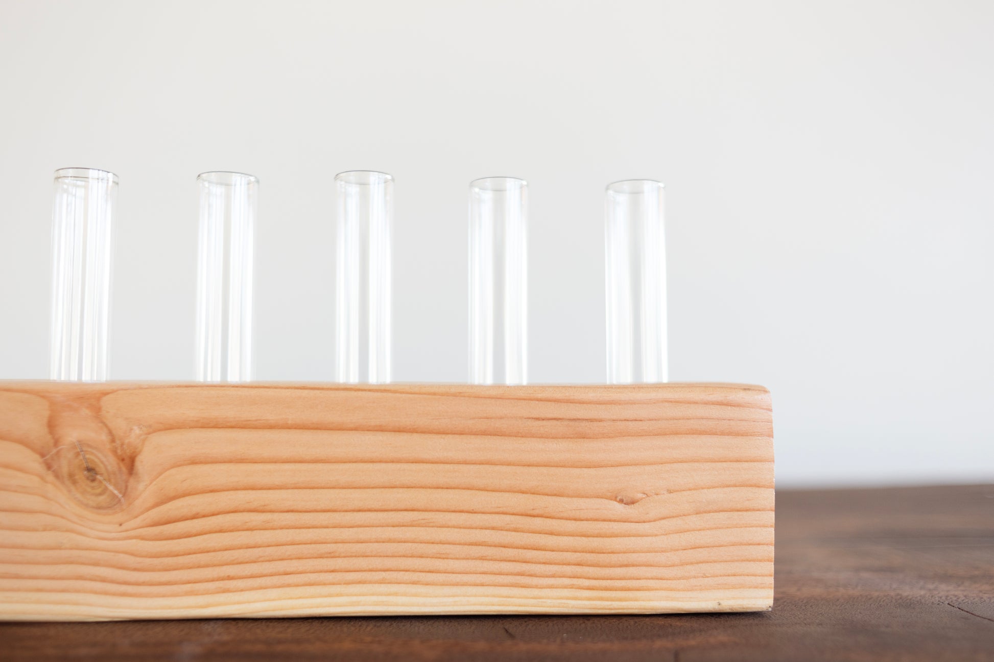 It is handmade from natural and durable materials, making it easy to clean and ensuring it will last forever. To clean, wipe off the base, rinse the vials, and place them in the dishwasher! That’s it!