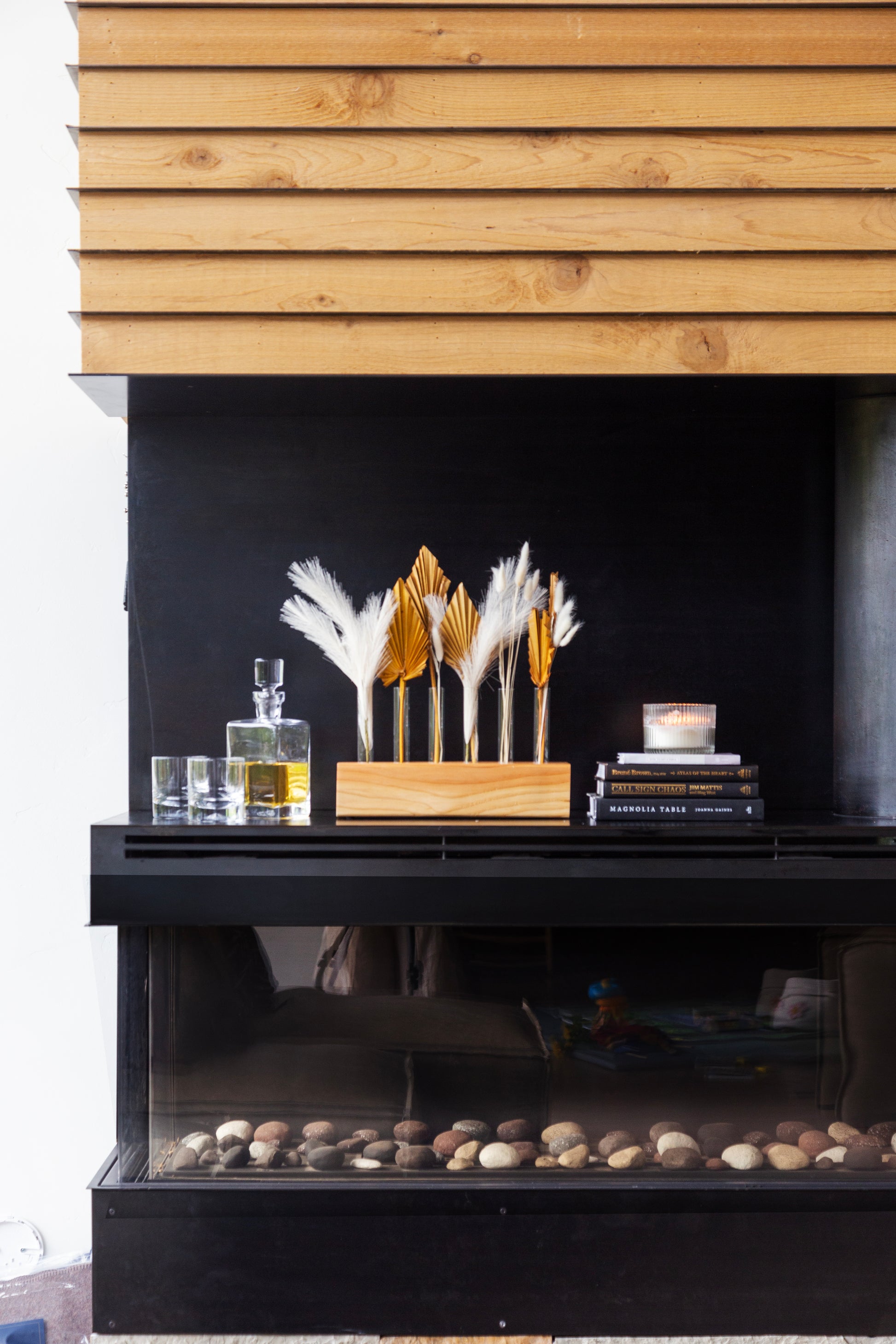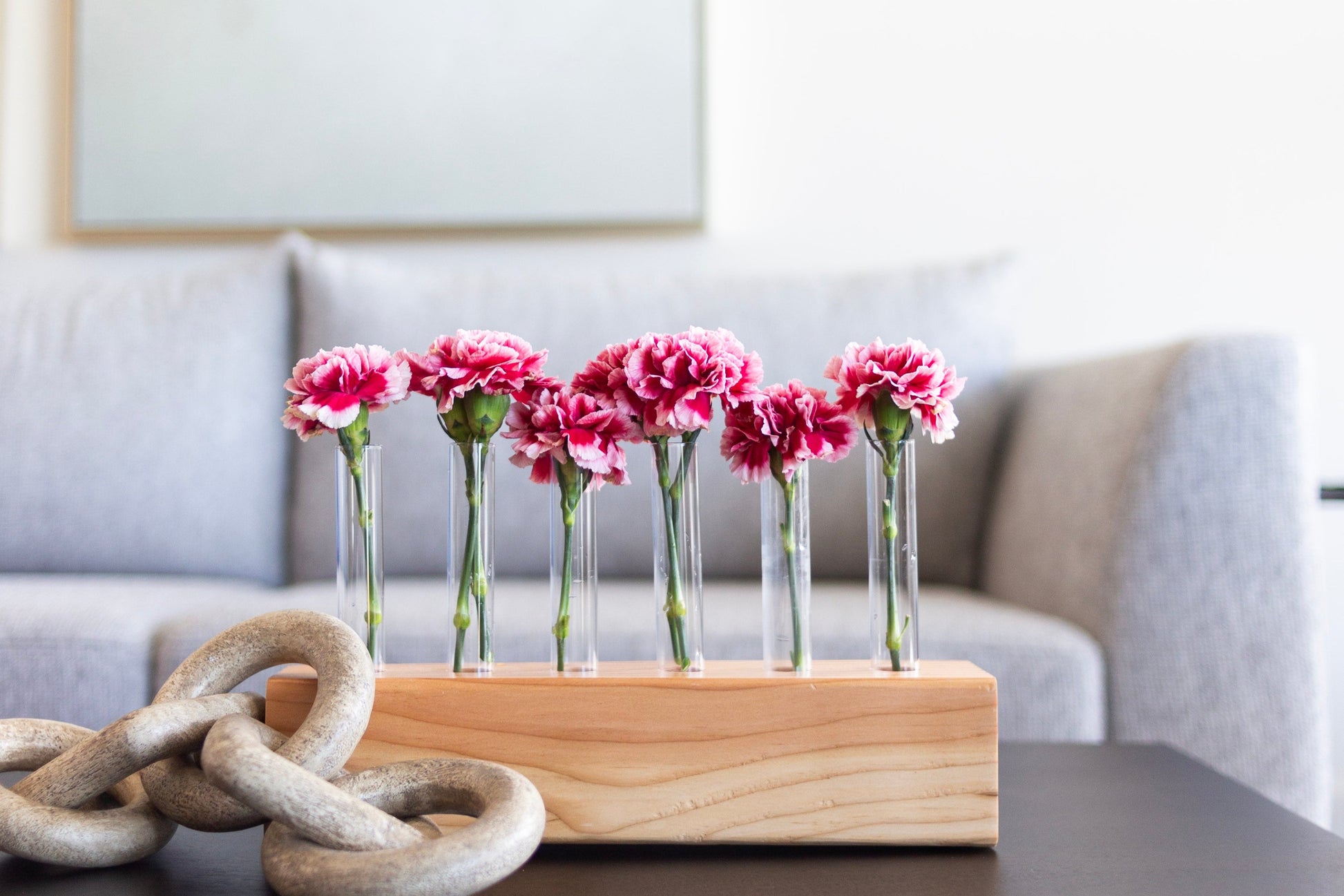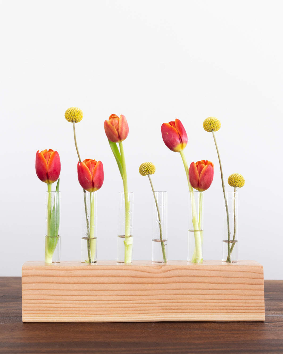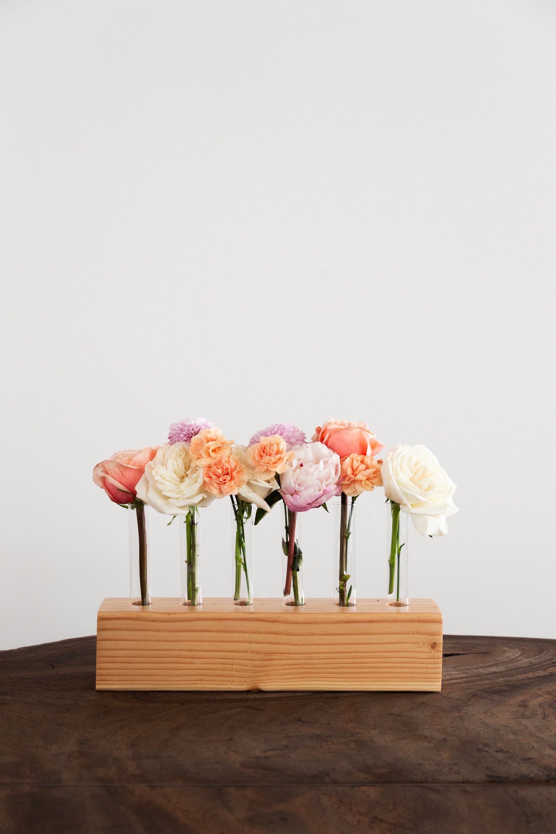 Our smallest centerpiece is 6 stems. It is perfect for small tables, nightstands, end tables, coffee tables, windowsills, and more. Glass and wood included.